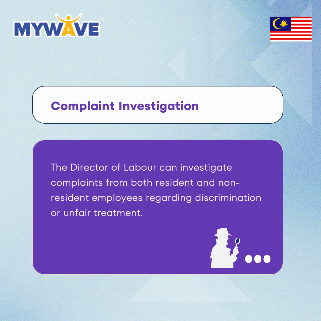 - Complaint Investigation: The Director of Labour has the authority to investigate complaints from both resident and non-resident employees regarding discrimination or unfair treatment.
