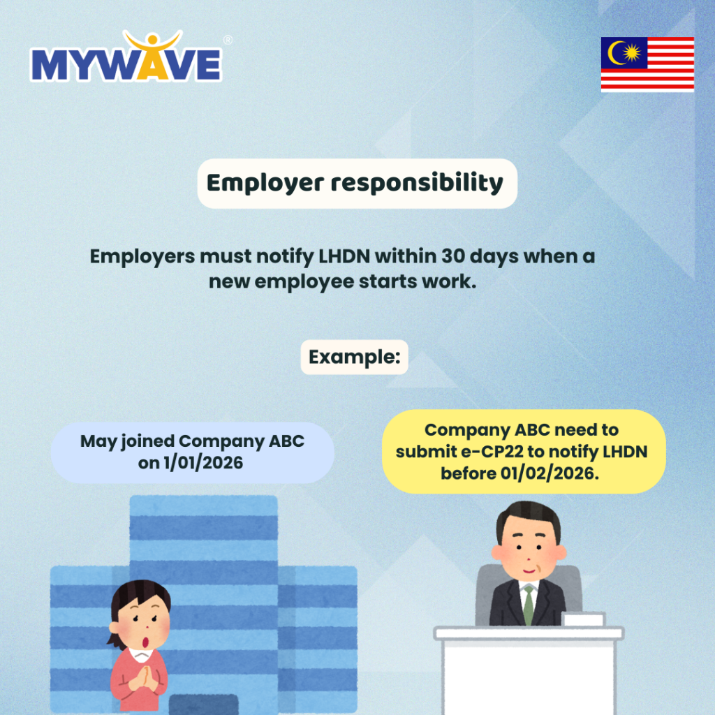 For example, if an employee joins on 1 January 2026, the employer must submit e-CP22 by 1 February 2026 to notify LHDN of the employment.