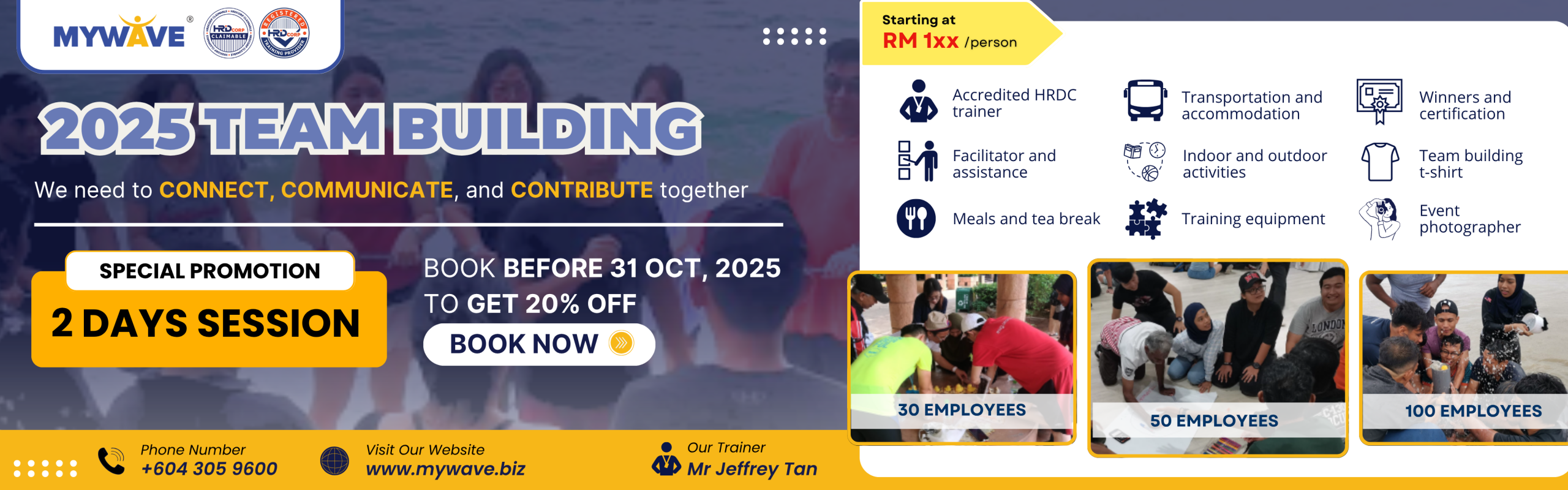 Our 2-day HRDC-claimable Team Building Program is crafted to help teams of all sizes foster better communication, stronger collaboration, and long-term engagement β all while having fun.