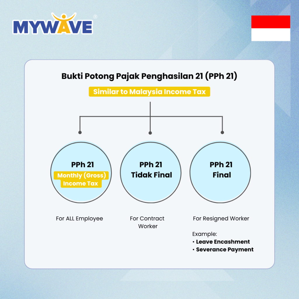 - PPh 21: This refers to the monthly income tax deducted from employees’ gross income. It is similar to Malaysia’s income tax system.