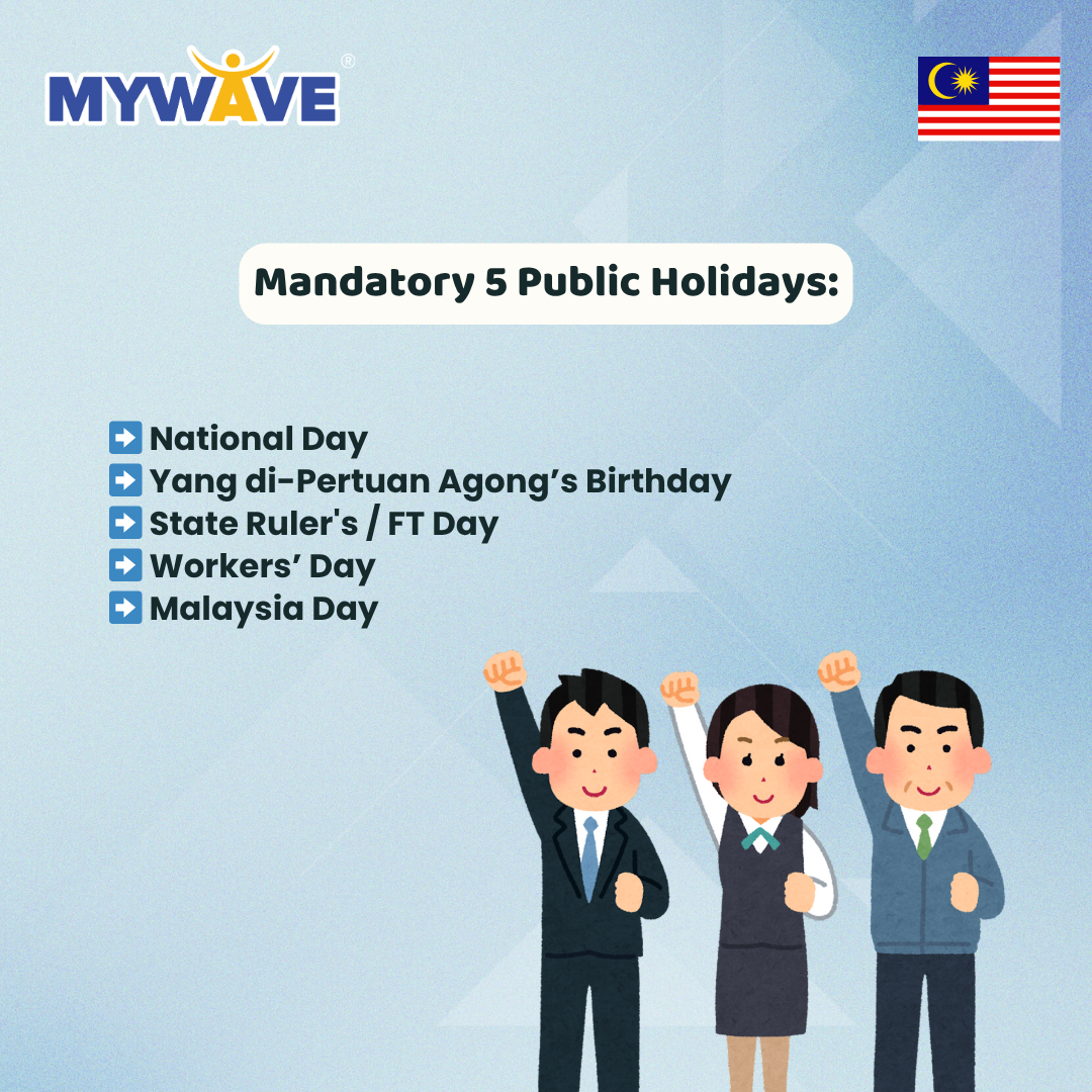 Employees are entitled to 11 gazetted public holidays annually. From these, 5 holidays are compulsory and must be granted as paid public holidays: